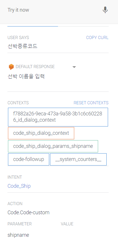 코드는 맞는데 결과값이 출력이 안될 때는 intent에서 phrases에 값이 들어가 있는지 확인하자.