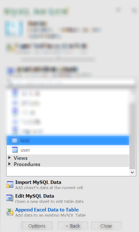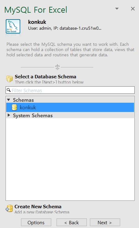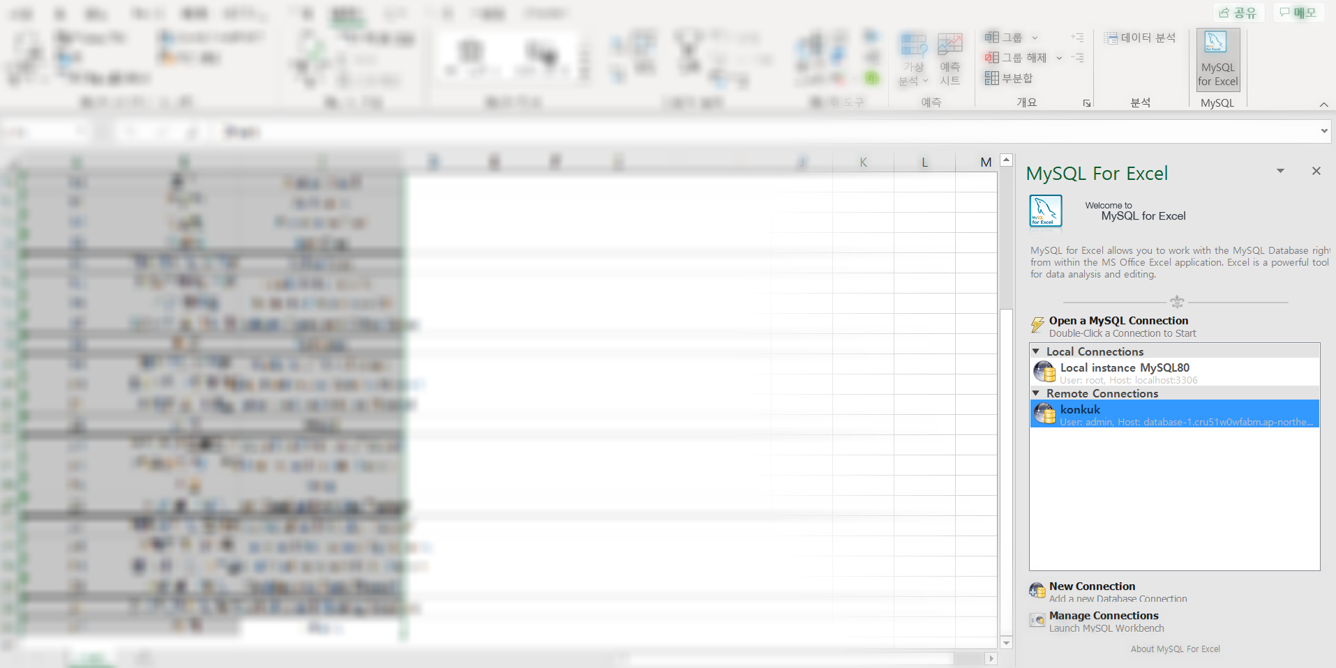 넣고싶은 부분(셀)을 드래그 한 후에 MySQL for Excel 버튼을 누르고 넣고싶은 데이터베이스를 더블클릭한다.