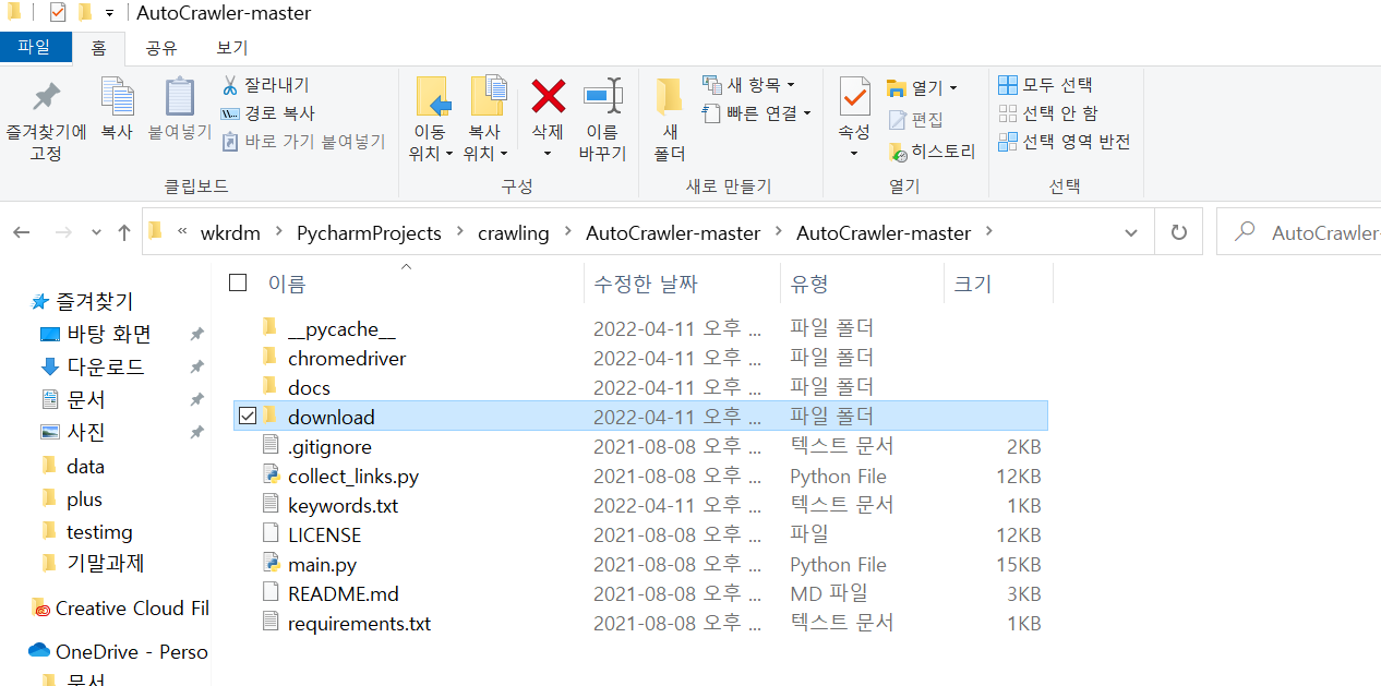 파이참에서 프로젝트 파일 만들고 다운받은 깃을 프로젝트 폴더에 넣는다
