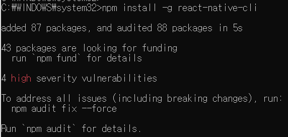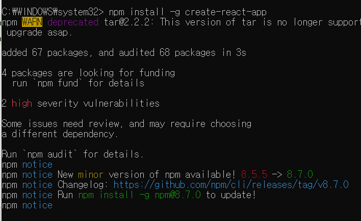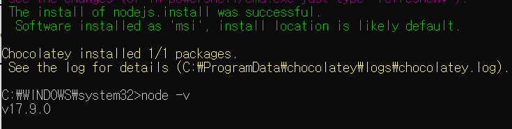 그 다음엔 다시 관리자 권한으로 cmd를 열어 nodejs를 설치해준다