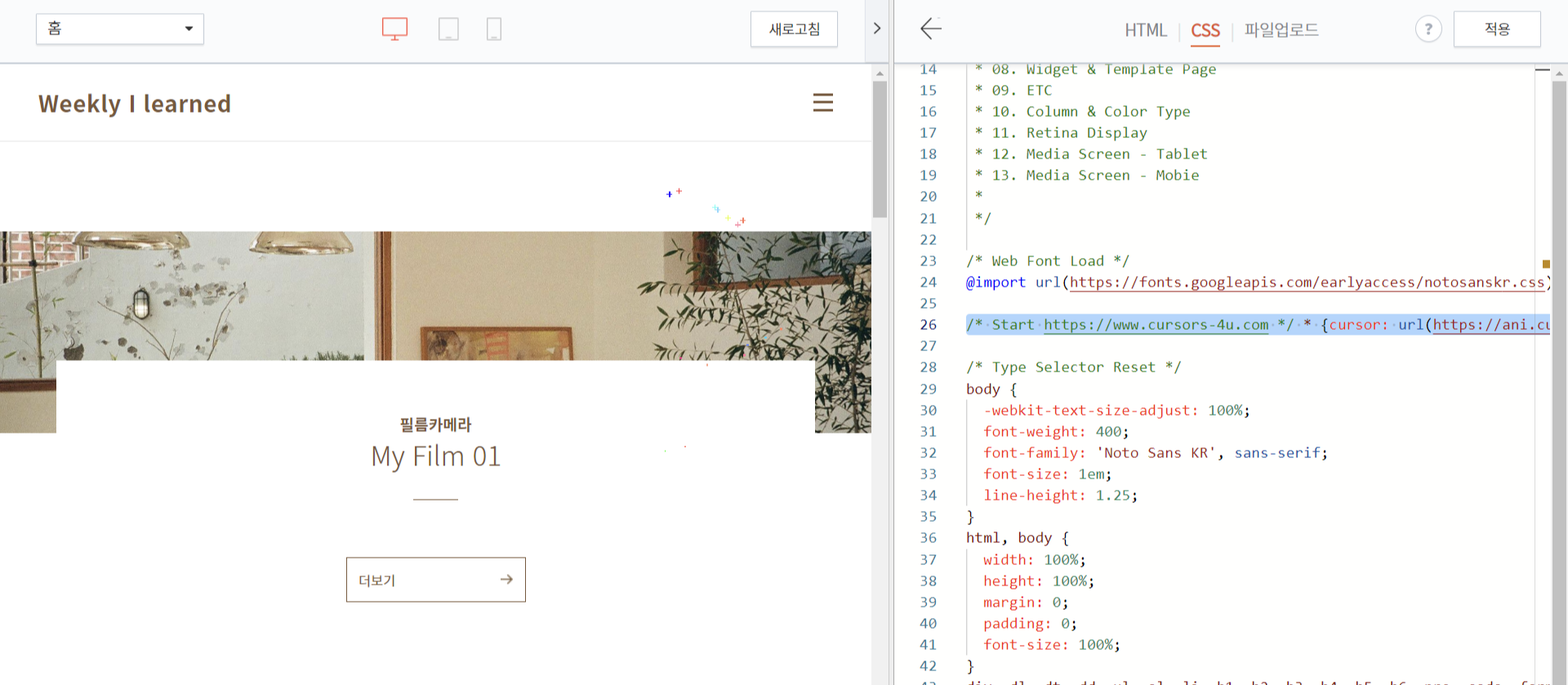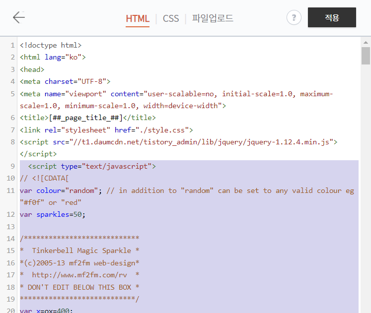 티스토리 스킨 편집에서 html 편집으로 들어가 CSS 위쪽에 아무데나 붙여넣기 하면 끝!