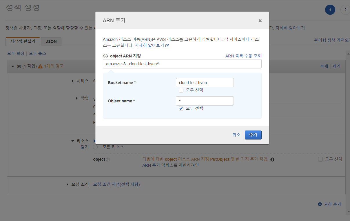 우리가 사용할 버킷에 대한 ARN을 추가해준다. (특정 버킷, 모든 파일)