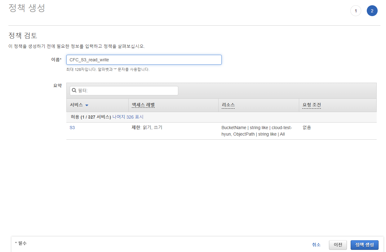 이제 정책 이름을 입력하고 요약을 보고 잘 됐는지 검토하면 끝~~