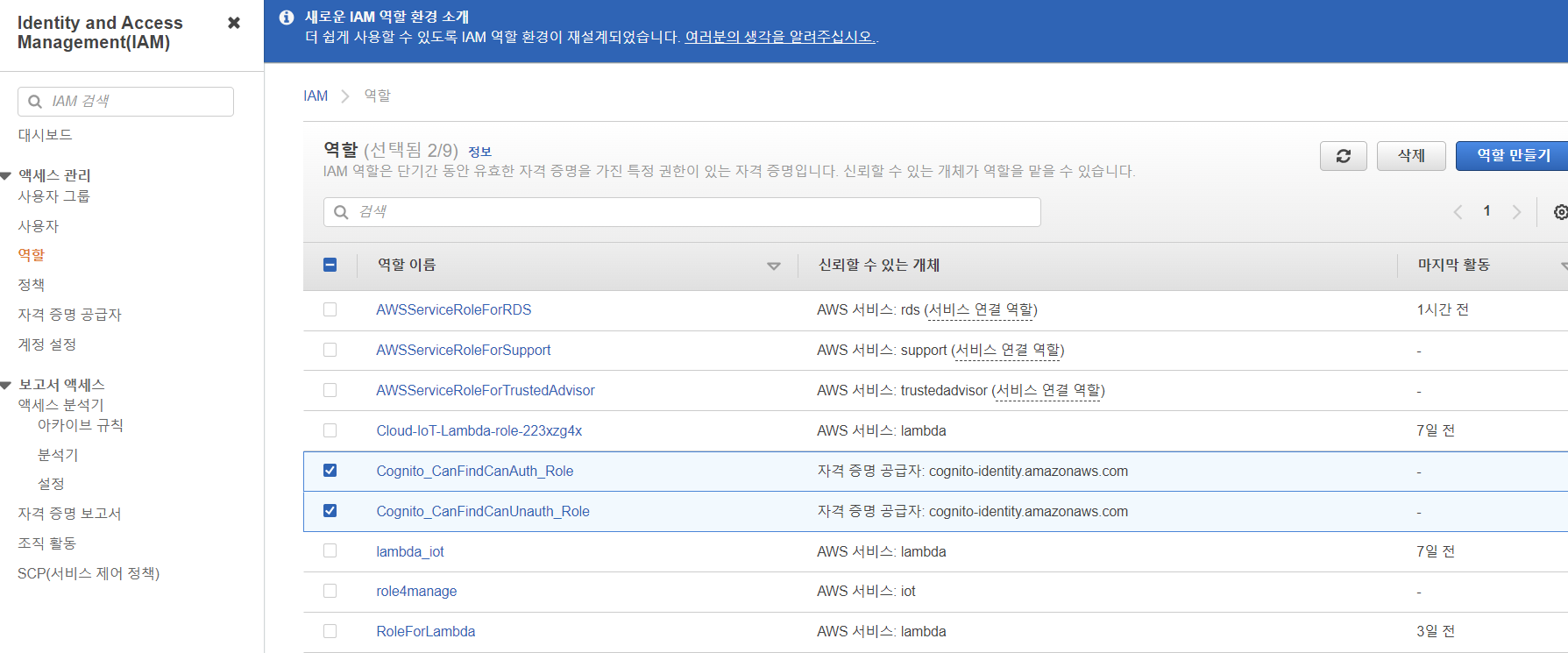 IAM > 역할로 들어가면 이렇게 아까 생성된 역할들이 얌전히 기다리고 있다