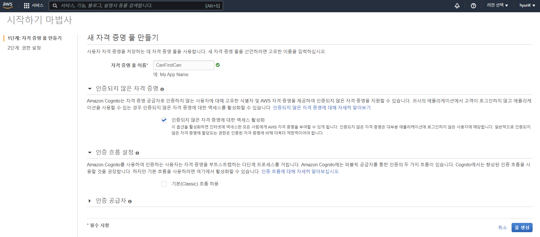 원하는 이름을 입력하고 우리 앱은 로그인 기능이 없기 때문에 인증되지 않은 자격 증명에 대한 액세스를 활성화 시켰다