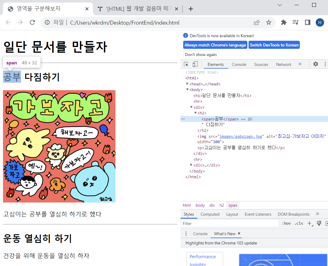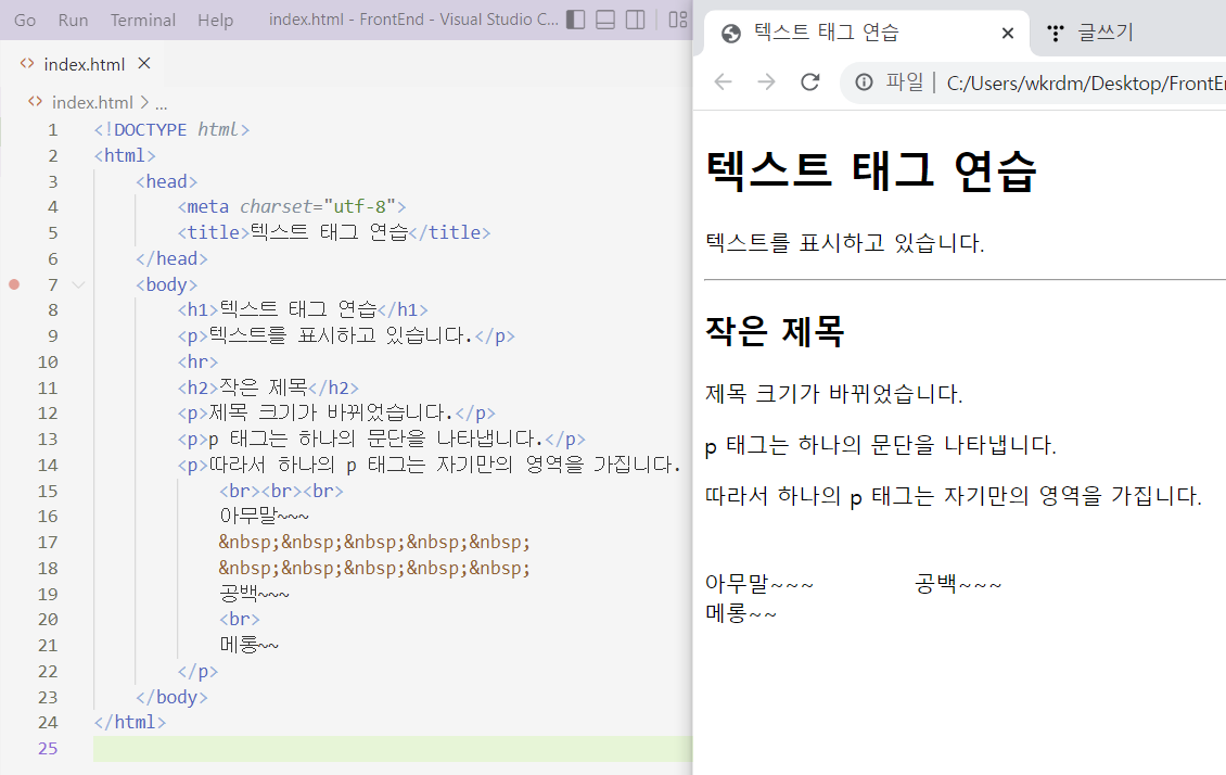 두 태그 사이에 단일 태그인 <br>을 넣으니 두 문장 사이 간격이 한 줄 띄워졌다.