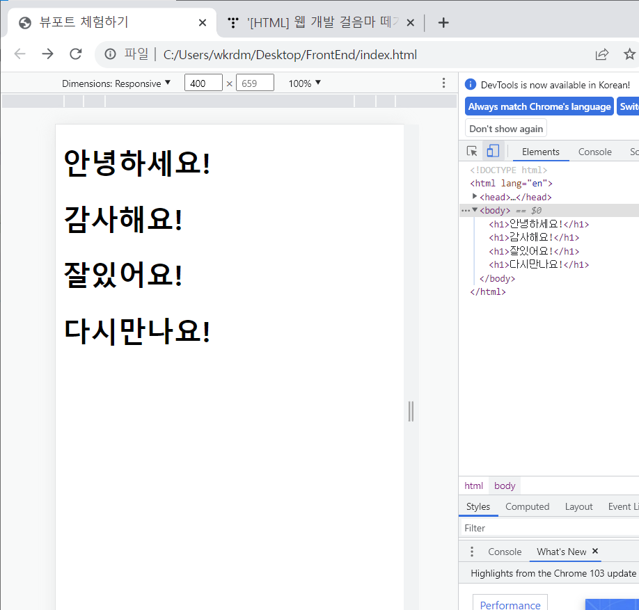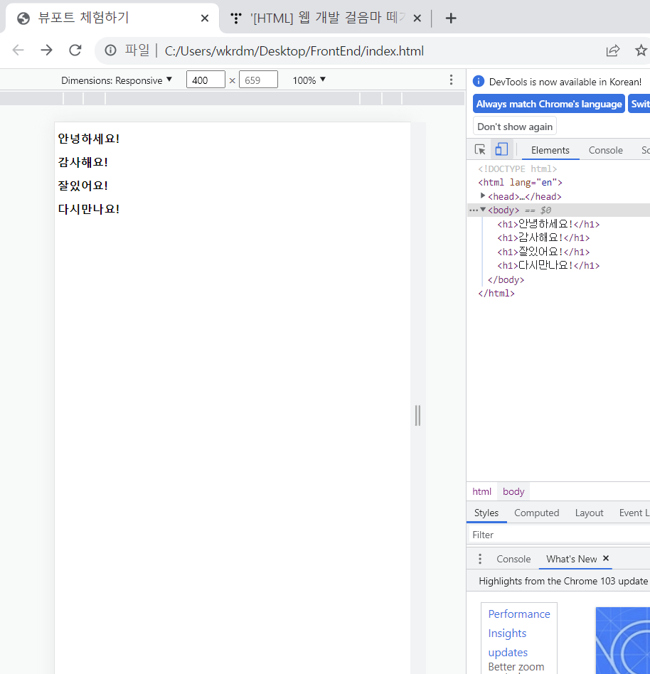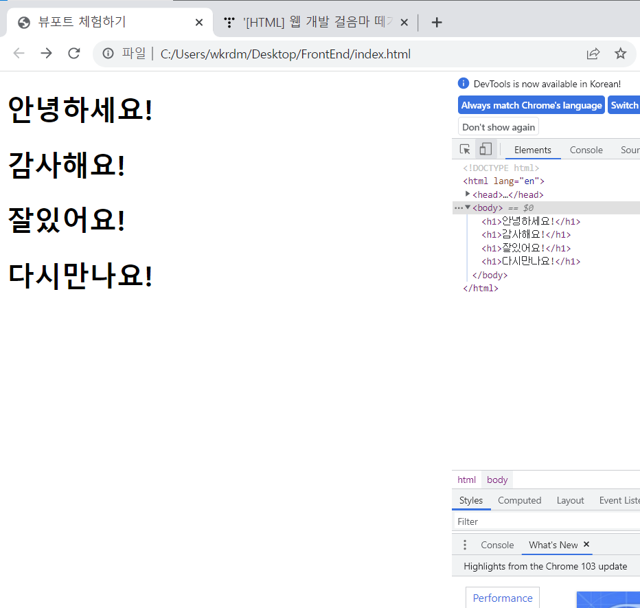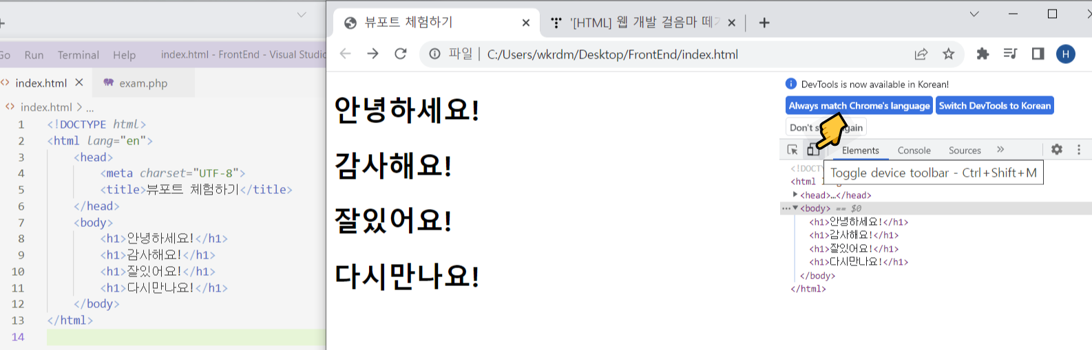뷰포트를 적용하면 PC와 모바일 화면이 동일하게 조정되어 적용된다.