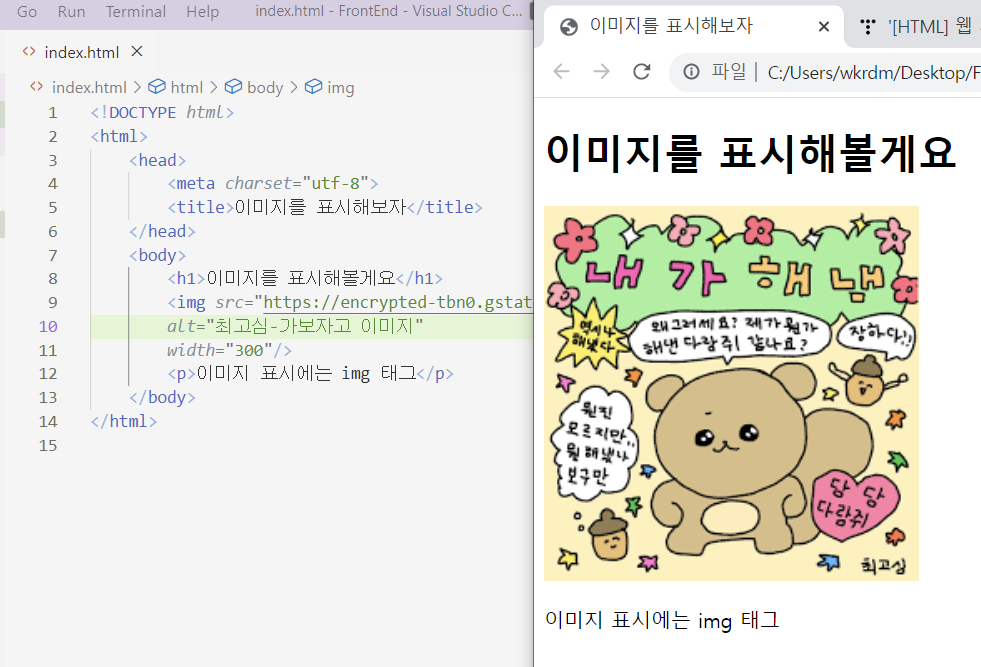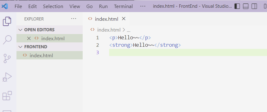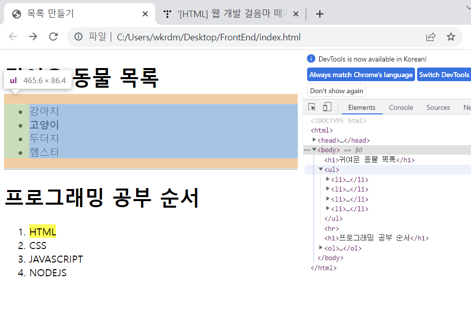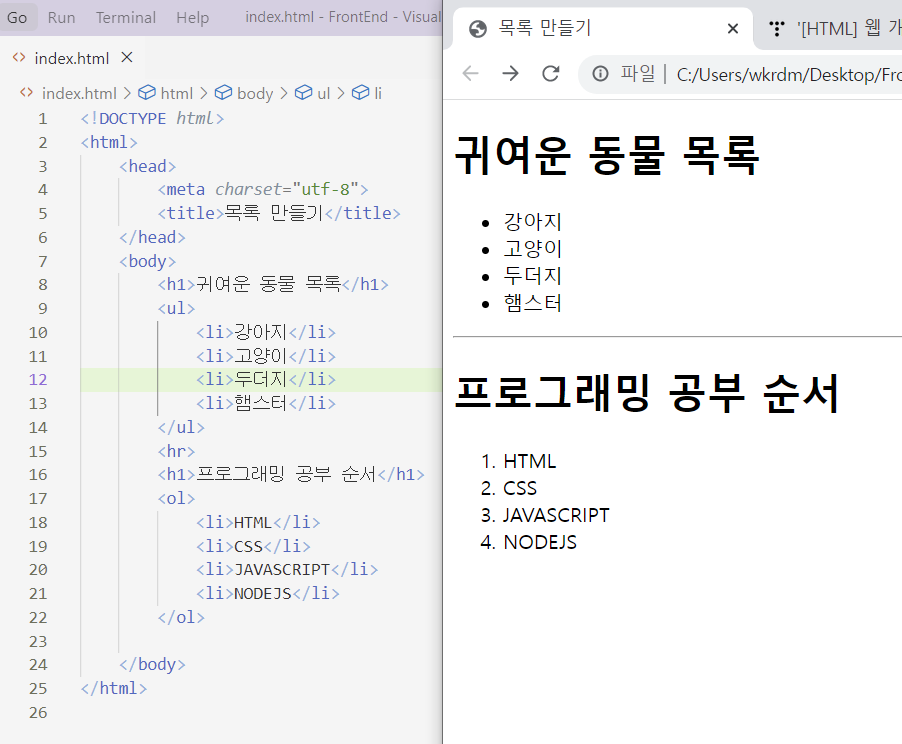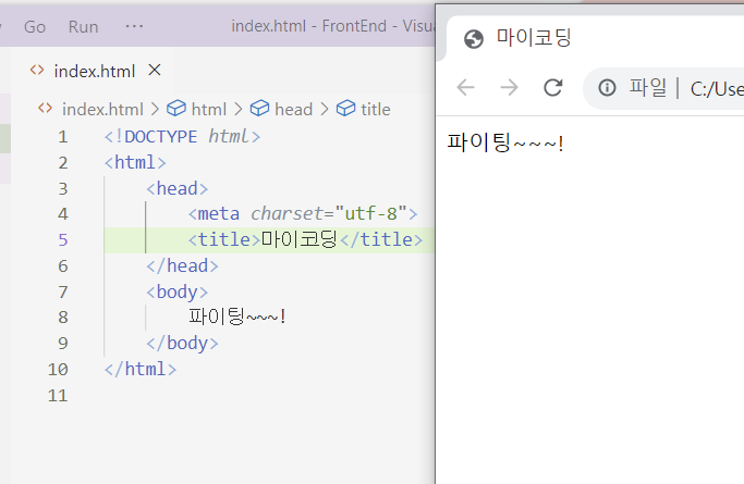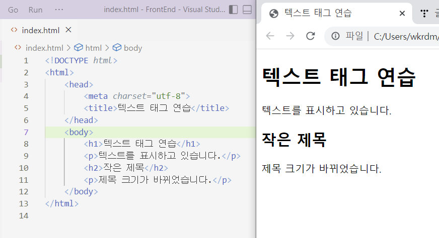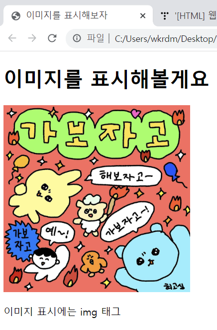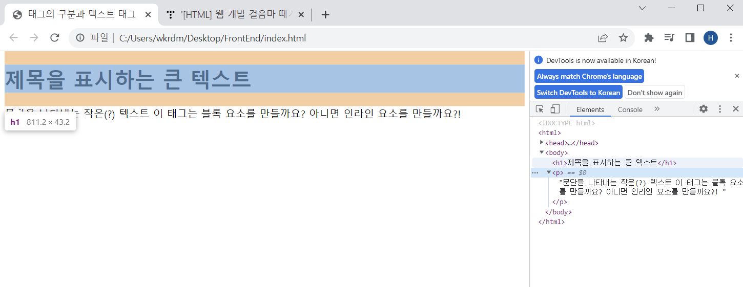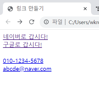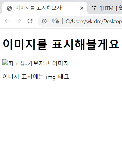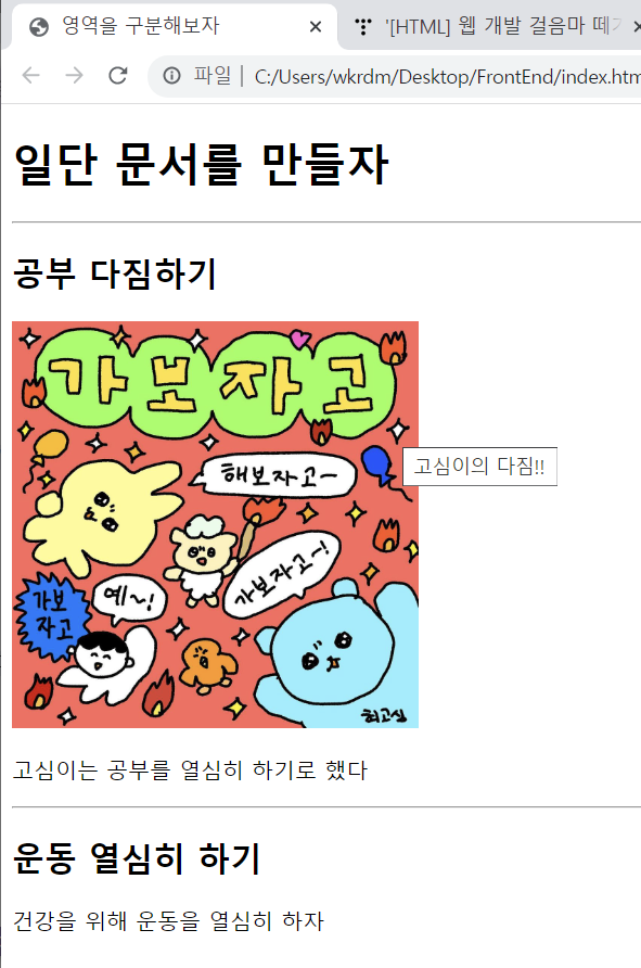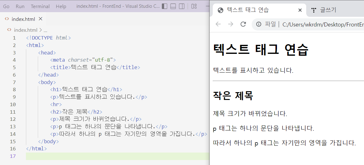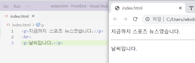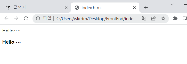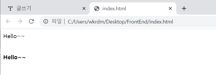 여는 태그와 닫는 태그를 작성하고 웹브라우저로 열었을 때 결과이다.