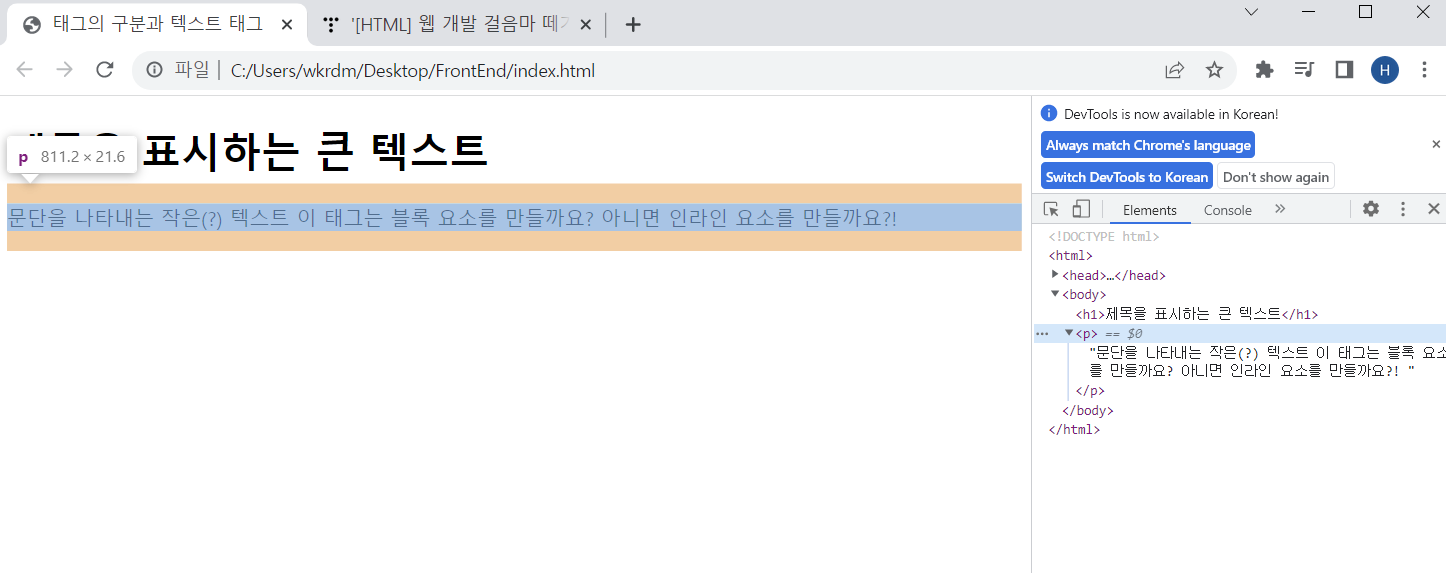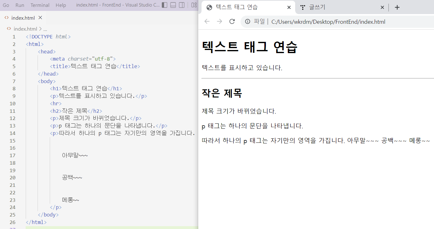 하나의 p 태그는 하나의 문단을 표현한다. 문단과 문단 사이에는 공백이 있다.