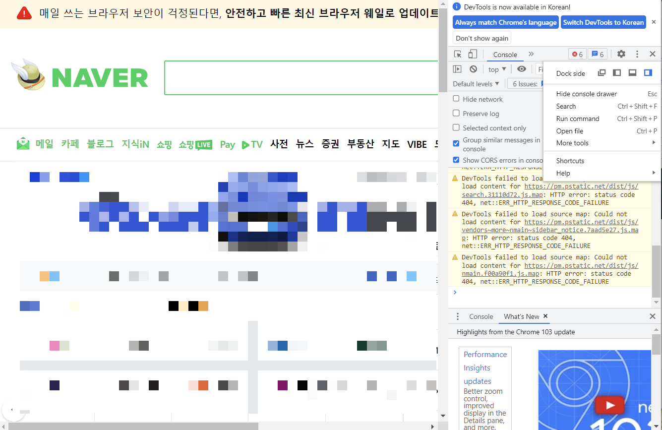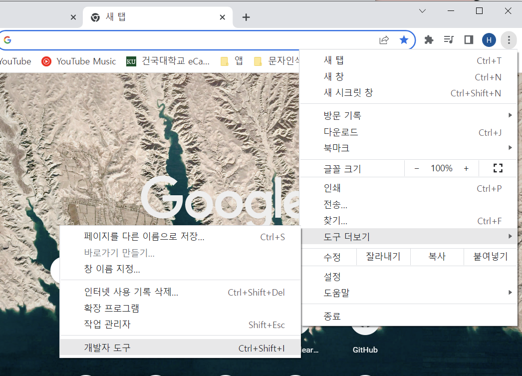 F12 / 메뉴 - 도구 더보기 - 개발자 도구