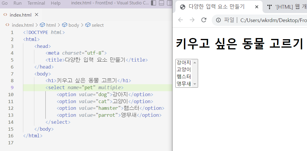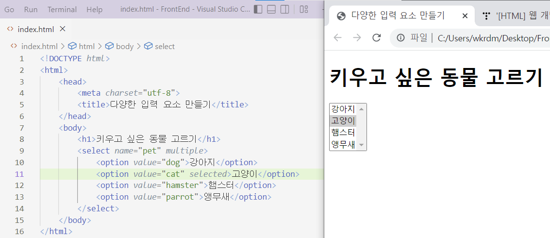 multiple : 값이 아니라는 뜻. ctrl을 누르고 선택하면 여러개 선택 가능