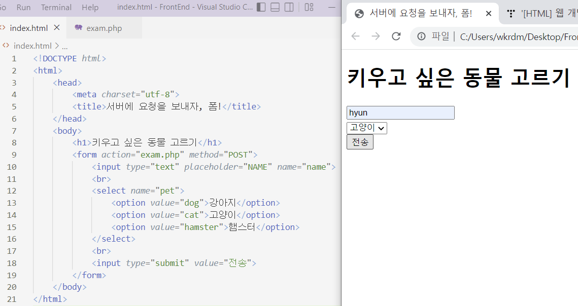 전송(submit)을 누르면 우리가 만든 서버가 실행 된다.