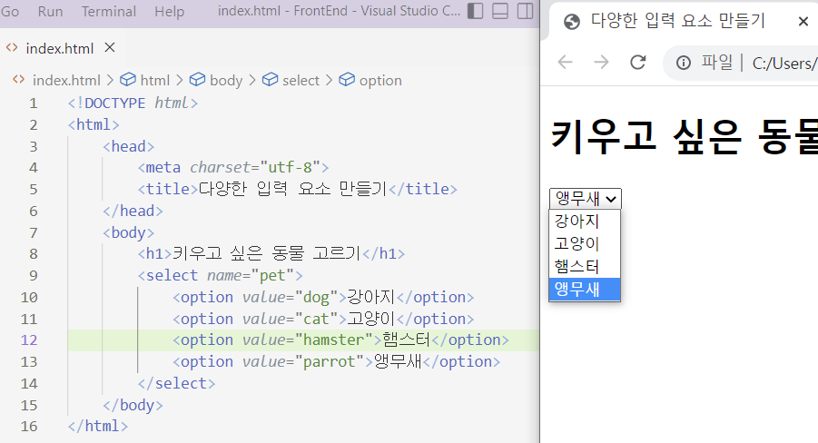 input과 마찬가지로 name을 지정할 수 있으며 각각의 option에는 value 속성을 지정할 수 있다.