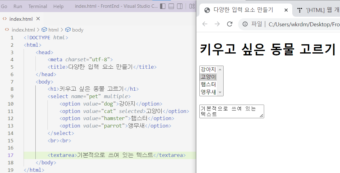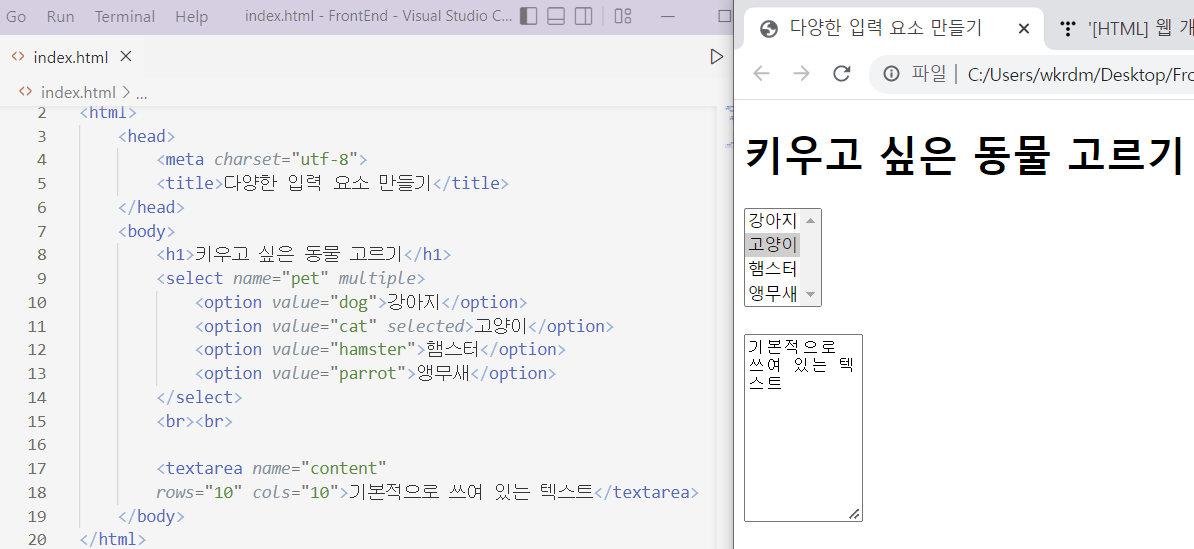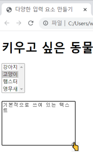 textarea : 여러 줄의 일반 텍스트를 입력할 수 있는 입력 요소