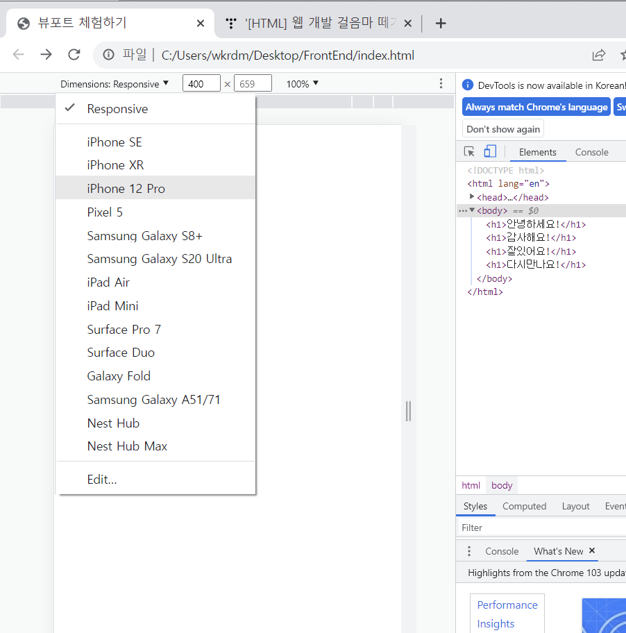 이렇게 모바일 화면으로 볼 수 있고 기기를 선택할 수 있다.