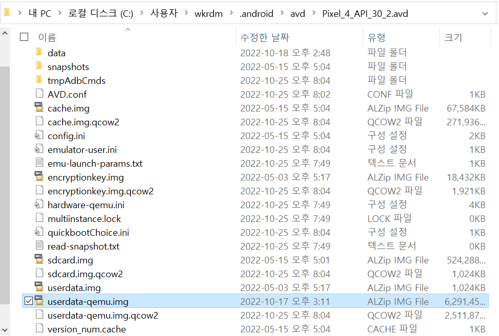 파일 경로 : C드라이브 > 사용자 > 현재 사용중인 계정 폴더 > .android > avd > 문제가 생긴 애뮬레이터 폴더
