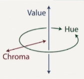- 색상(Hue)은 둘레의 원으로, 채도(Chroma)는 중심선으로부터 방사선으로, 명도(Value)는 중심축으로 배치한 것