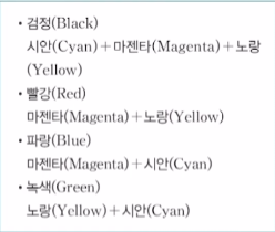 시안(CYAN) + 마젠타(MAGENTA) + 노랑(YELLOW) = 검정(BLACK) - 혼합할수록 어두워짐(명도가 낮아짐)