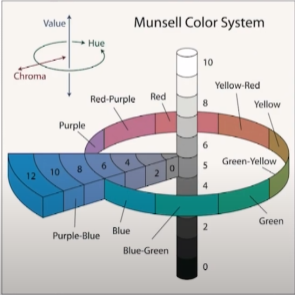 - 먼셀의 표색계는 무채색 축 바깥쪽으로 갈수록 채도가 높아짐