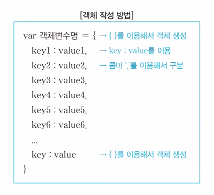 - 속성(Property)이라고 하는 키(Key)와 값(Value)을 { }안에 넣어 표현